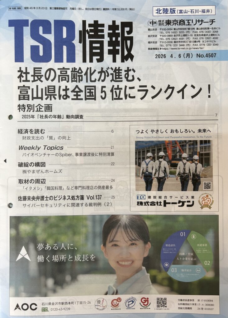 お知らせ 2026.04.06 プレスト 広告掲載のお知らせ 東京商工リサーチ様が発行する情報誌「TSR情報」の北陸版、新潟版、秋田版に当社の広告が掲載されます。掲載期間は2026年4月から2027年3月の1年間です。是非ご覧ください。 プレスト 新CM完成! >>